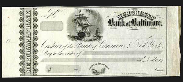 Maryland. Merchant's Bank of Baltimore. Check on Bank of Commerce, NY. DB&Co. printers. Fine or better.
