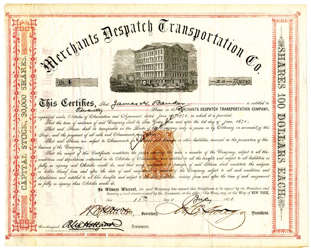 New York, 1871. 20 Shares I/C Stock Certificate, low S/N 4, Black text with thin red border, 5 cent Lincoln in Brown IR Stamp at center, Large building depicted at top center. Signed by James C. Fargo as company president, and William Vanderbilt's name appears on back stock transfer. Cancelled in ink, signatures crossed-out, and POCs. Fine condition. The Merchants Dispatch Transportation Company (MDT, also known as the Merchants Dispatch Refrigerator Line) was established in 1857 or 1858 by the American Express Company of New York (then a freight forwarding service). James Congdell Strong Fargo (May 5, 1829 Ð February 8, 1915) was a president of the American Express Company for 30 years, and the brother of American Express Company and Wells Fargo co-founder, William Fargo.