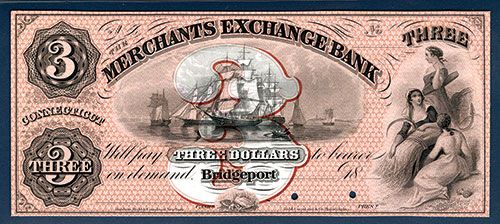 Bridgeport, Connecticut, 18xx (ca. 1850's), $3, CT-55-G6aP, pp A, Proof printed on india paper unmounted, black on red-brown, 3 allegorical women at right, sailing ships in middle, nesting ducks at bottom, POC's, PMG graded Choice Uncirculated 64, very attractive note with large even margins. BB&C.
