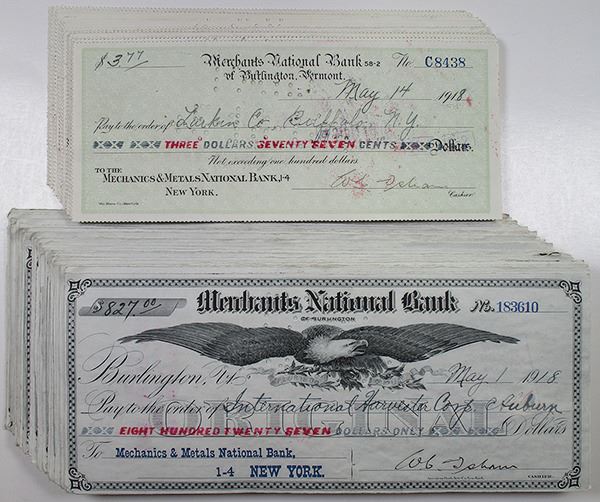 Burlington, VT. Lot includes of 109 pieces, all I/C checks from Merchants National Bank, located in Burlington, Vermont. Some of the checks have black text with green background, the rest have black text with a large eagle depicted at top center. Fine condition, most dating from 1918. 109 pieces. Merchants Bank was organized in 1849 and took a national charter in 1865 becoming The Merchants National Bank of Burlington, Vermont. (109)