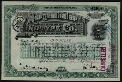 New York, 1896, Issued and Cancelled Stock, #89, 100 Shares, Printing machine vignette on top right, VF condition with POC's and purple cancellation stamp, HLBNC.