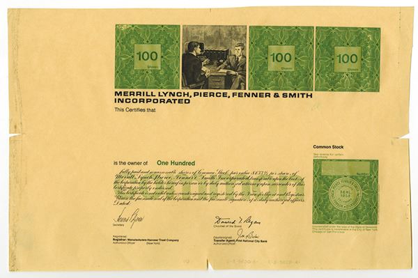ND (ca.1971-80). 100 Shs, Proof printed in green and black on light brown paper. Broker talking to customer sitting at his desk vignette. Facsimile signature of Donald Regan as Chairman of the Board (and future Secretary of the Treasury under Ronald Reagan). Large margins with alignment notches for printing. Proof for 100 shares of common stock. Green and black. Edge faults, unused, VF. Unique in archives.