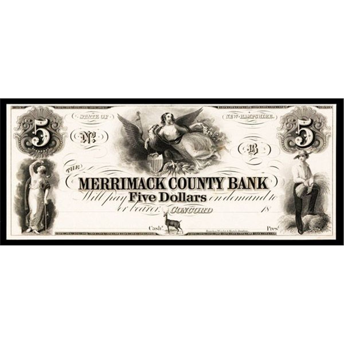 Concord, New Hampshire, 18xx (ca.1830's), $5, Plate B, NH-35-G46, Unlisted in census, Proof banknote, black on india paper on thin white card, Standing Allegorical Justice on left, male reaper on right with allegorical woman and patriotic eagle and shield in middle, Choice to Gem Uncirculated condition, Rawdon, Wright, Hatch & Co. Boston imprint. Unlisted as proof. (Silver City Collection, Part 2)