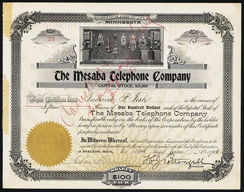 Minnesota, 1906, 15 Shares I/C, , #23, Black print with black ornate border and gold seal and underprint, Vignette top center of early telephone models, Cancelled in red handwriting, VF condition.