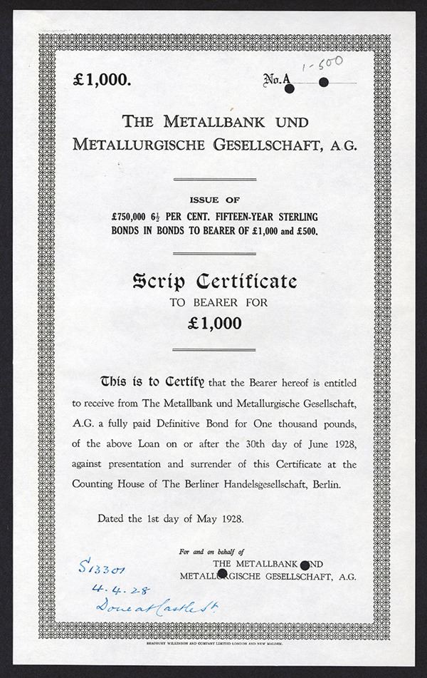Germany. 1000 Pound Bond Specimen. Black. BWC. POC. Pencil and ink printer notations. As made. Choice Extremely Fine.