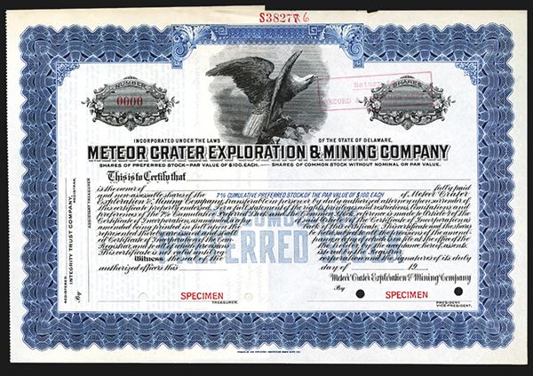 Crater located near Winslow, Arizona. Blue border, Eagle, preferred stock Specimen, FL-ABNC, EF. Original known as Franklin's Hole, Meteor Crater was discovered by one of Custer's scouts around 1871. While fragments indicated the presence of iron, no large body of iron ore has been located and mined to date.