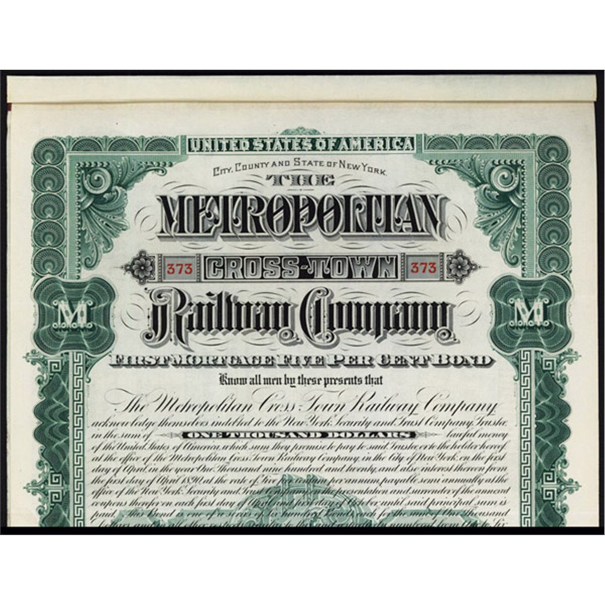 New York, 1890, $1000, 1st Mortgage 5% Bond, Issued and uncancelled, Black on green border and underprint, ornate title with no vignette, coupons attached, International BNC. VF condition. The Metropolitan Cross town Railway was chartered in 1889 and opened in 1891. the company was acquired in 1894 by the Metropolitan Street Railway. The company had 7 miles of track and operated on Delancey Street in New York.
