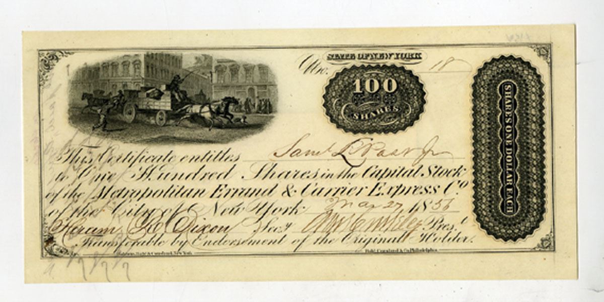 New York, 1856. 100 Shares I/U Capital Stock Check Sized Certificate, Black printing with simple black border, Small vignette of fast moving horse drawn cart at top left corner, S/N 18, AU to Uncirculated condition, BB&C.