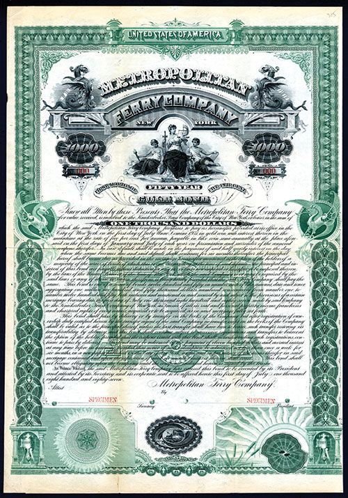 New York, 1887. $1000. Ornate green border and undertint with title flanked by sea serpents on top with three allegorical figures underneath title and small ferry boat on bottom. Coupons attached. Rare and very attractive ferry company bond. Red specimen overprints, “0000 “ serial numbers and POC's. XF condition. Homer Lee BNC. Unique in archive.