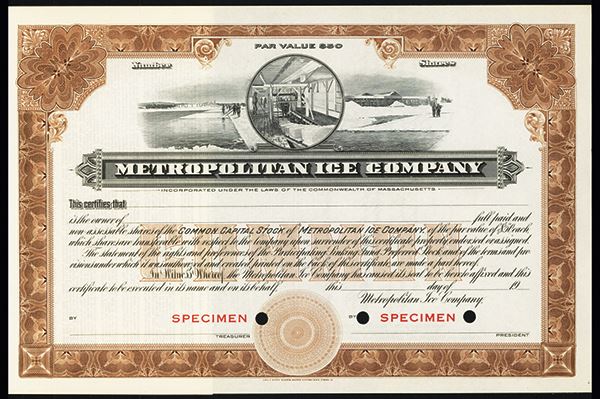 Massachusetts, 19xx, Odd Shares, Specimen Stock, Black on brown border and underprint, Vignette top center of ice processing facility, Red SPECIMEN overprints and POC's, VF-XF condition, SBNC.