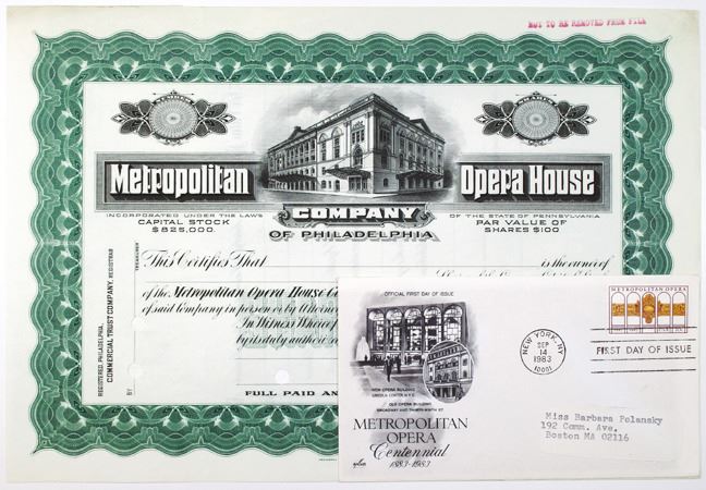 Pennsylvania.... Lot of 2 pieces, Includes: ND (1900-1920s) Odd Shares Specimen Capital Stock Certificate in green, AU condition, SBN; Also includes a VF commemorative black and white envelope cover, 6.5 x 3.5 inches, New Opera Building at Lincoln Center, New York City at left, with the Old Opera Building in front. Commemorates the Metropolitan Opera Centennial, 1883-1983. Also includes a Metropolitan Opera adhesive stamp, with First Day of Issue black stamp underneath. (2) (John E. Herzog Collection)