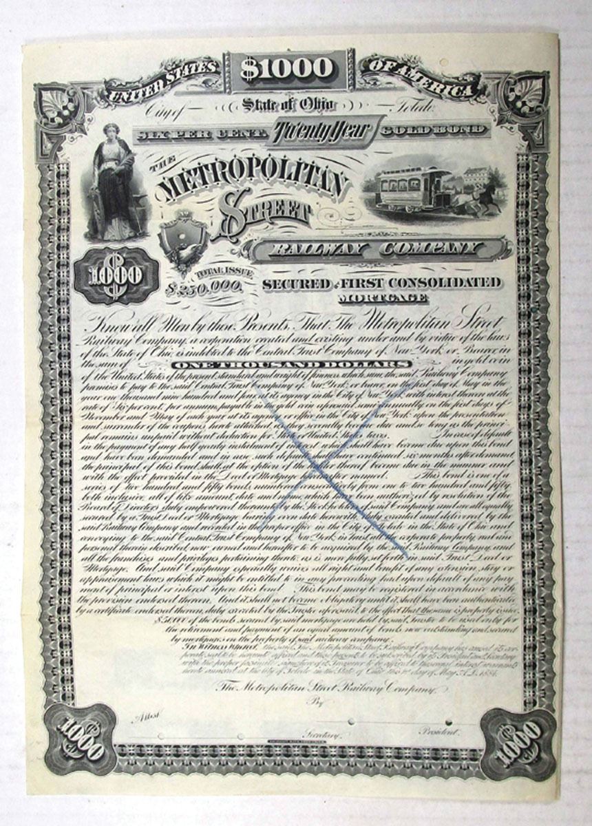 Ohio, 1884. $1000 Specimen 6% First Consolidated Mortgage Gold Coupon Bond, Black printing with black border, Multiple vignettes at top, POCs and large "X" across face, VF to XF condition, FBNC.