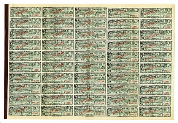 Illinois. $1000, Specimen 1st Mortgage 5% Gold Coupon Bond. Black on Green border and underprint. Seated allegorical woman on top under arched title and standing woman on bottom. VF condition with a small 1 inch split on the right border with a small sliver missing. Red specimen overprints and POC's. ABNC. Unlisted as a Coupon Bond in Cox, only as a registered bond, Rare and very attractive with only 2 found in the archives and this is the only one available.