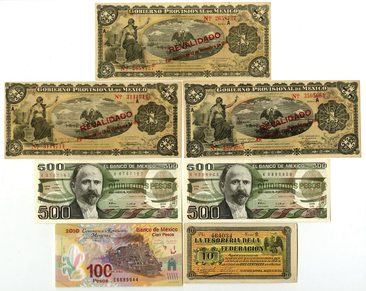 Mexico, 1914-2007. Lot of 7 Issued Banknotes from Various Mexican Banks, Includes: Gobierno Federal de la Republica Mexicana, 1914, 1 Peos, P-S701b (3) MI-DF-6; La Tesoreria de la Federacion, Guaymas, 1914, 10 Centavos, P-S1058, SI-SON-4; Banco de Mexico, 1983, 500 Pesos, P-79a (2), BdM; 2007, Independence and Revolution Commemorative Issue, 100 Pesos, P-128b. Notes range from XF to Gem UNC condition. (7). Sold "AS IS" no returns accepted.