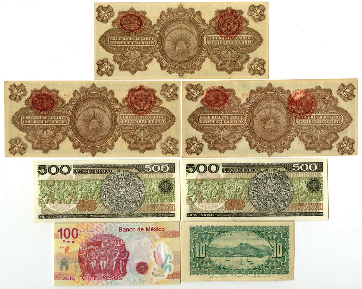 Mexico, 1914-2007. Lot of 7 Issued Banknotes from Various Mexican Banks, Includes: Gobierno Federal de la Republica Mexicana, 1914, 1 Peos, P-S701b (3) MI-DF-6; La Tesoreria de la Federacion, Guaymas, 1914, 10 Centavos, P-S1058, SI-SON-4; Banco de Mexico, 1983, 500 Pesos, P-79a (2), BdM; 2007, Independence and Revolution Commemorative Issue, 100 Pesos, P-128b. Notes range from XF to Gem UNC condition. (7). Sold "AS IS" no returns accepted.