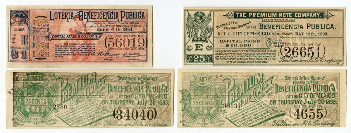 Mexico City, Mexico, 1891-93. Lot of 4 Lottery Tickets from Loteria de la Beneficencia Publica (1) and Premium Note Company (3). Tickets are in XF to AU condition. (4).