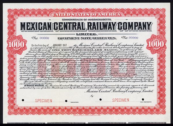 Mexico. $1000 Specimen 5% Equipment Note, Series 10 Coupon Bond. Black print with a red border and under tint. No vignette on certificate, company title at top. Specimen overprints, POC's, VF-XF condition with coupons attached. ABNC.