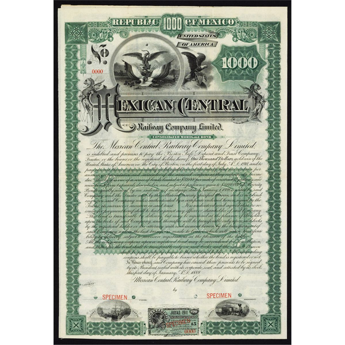 Republic of Mexico, 1889, $1000 bond, Specimen, Eagle and snake, eagle and shield, Green, ABNC, POC's, XF.