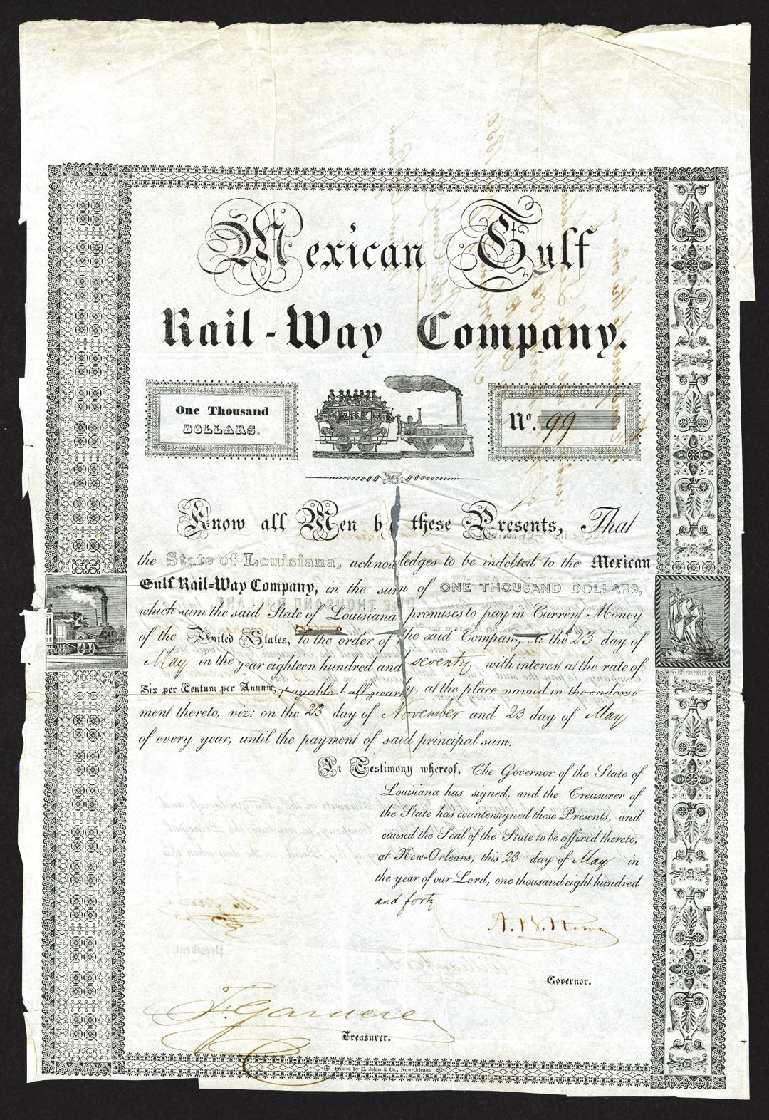 New Orleans, Louisiana. $1000, 7% 30 Year Bond. I/Cut Cancelled, Black on light blue, Small train on top, S/N 99, Paper separation at folds. No coupons remain. Fine with internal cuts and separations from cancellation. Rare Louisiana railroad. Signed by Andre B. Roman as Governor of Louisiana. He served in this role from 1831-1835 and again from 1839-1843. Roman rammed legislation through that made Louisiana banks sound. Established first public schools in state. Printed by E. Johns & Co., New-Orleans.