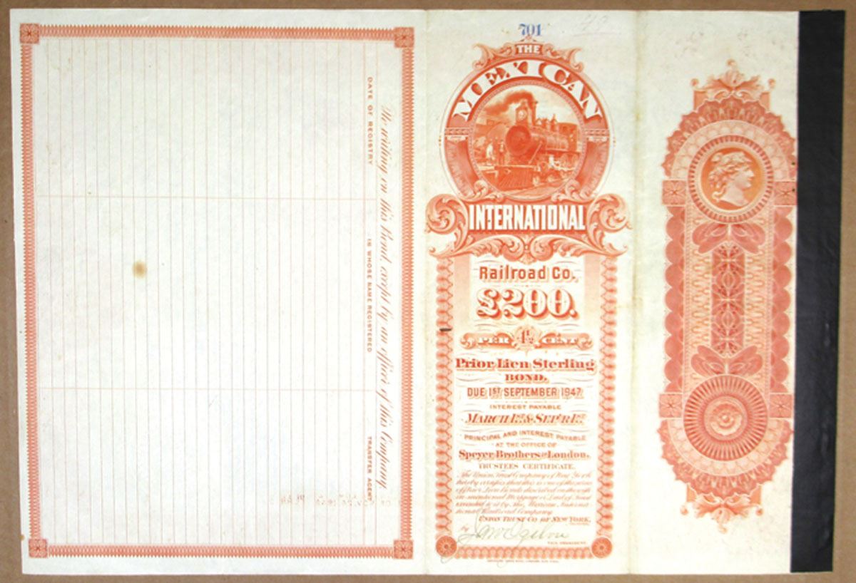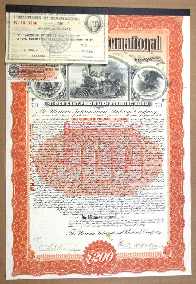Mexico, 1897. 200 Pounds Sterling, I/U, 4 1/2% Coupon Bond, Mexican Certificate of Registration on upper left with 3 coupons, Black on orange-red border and underprint, locomotive with people R-L flanked by U.S. and Mexican eagles, S/N 701, VF condition with a light small stain in the middle bottom and a couple of staple rust spots, overprints at left vertically "Assented to Feb 20, 1946 Agm't Modified by Agm't of Nov. 24, 1949". Rare and attractive bond. ABNC.
