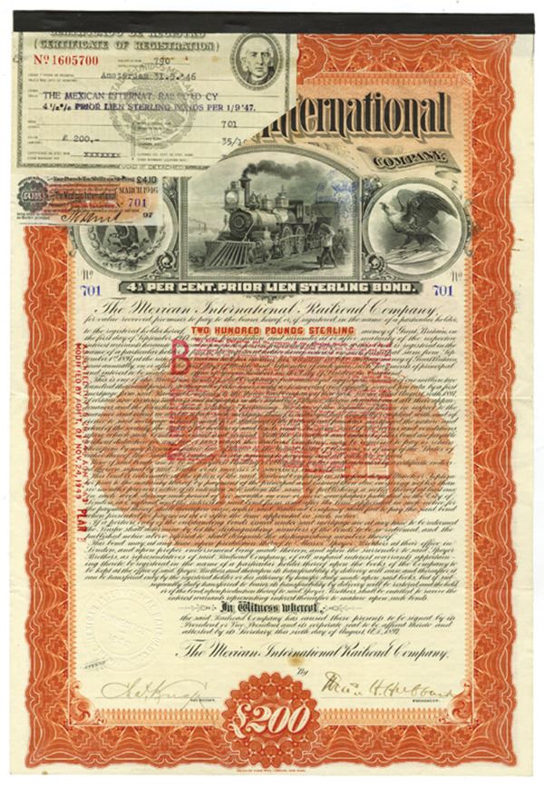 Mexico. 200 Pounds Sterling, I/U, 4 1/2% Coupon Bond, Mexican Certificate of Registration on upper left with 3 coupons, Black on orange-red border and underprint, locomotive with people R-L flanked by U.S. and Mexican eagles, S/N 701, VF condition with a light small stain in the middle bottom and a couple of staple rust spots, overprints at left vertically "Assented to Feb 20, 1946 Agm't Modified by Agm't of Nov. 24, 1949". Rare and attractive bond. ABNC.