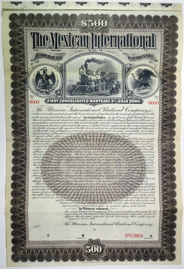 Mexico, 1897. $500 Specimen 4% First Consolidated Mortgage Gold Coupon Bond, Black text with brown border and undertint, Train illustrated at top center, flanked by American and Mexican eagles. Red specimen overprints, "0000" serial numbers, POCs. Fine-VF condition, Printed by ABN. Only known as a specimen in Cox. Extremely rare and attractive bond variety.