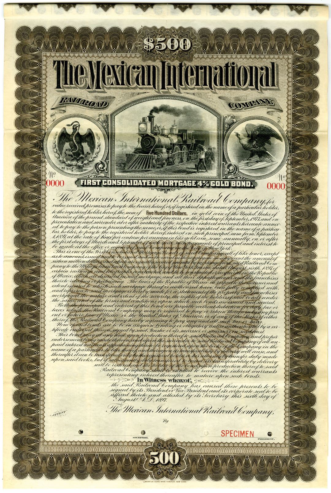 Incorporated in Connecticut, 1897. $500 Specimen 4% First Consolidated Mortgage Gold Coupon Bond, Black text with brown border and undertint, Men loading train flanked by Coat of Arms of Mexico and American eagle. Red specimen overprints, 0000 serial numbers, and POCs. VF condition, ABNC. Only listed as a specimen in this color and denomination, Rare in Cox.