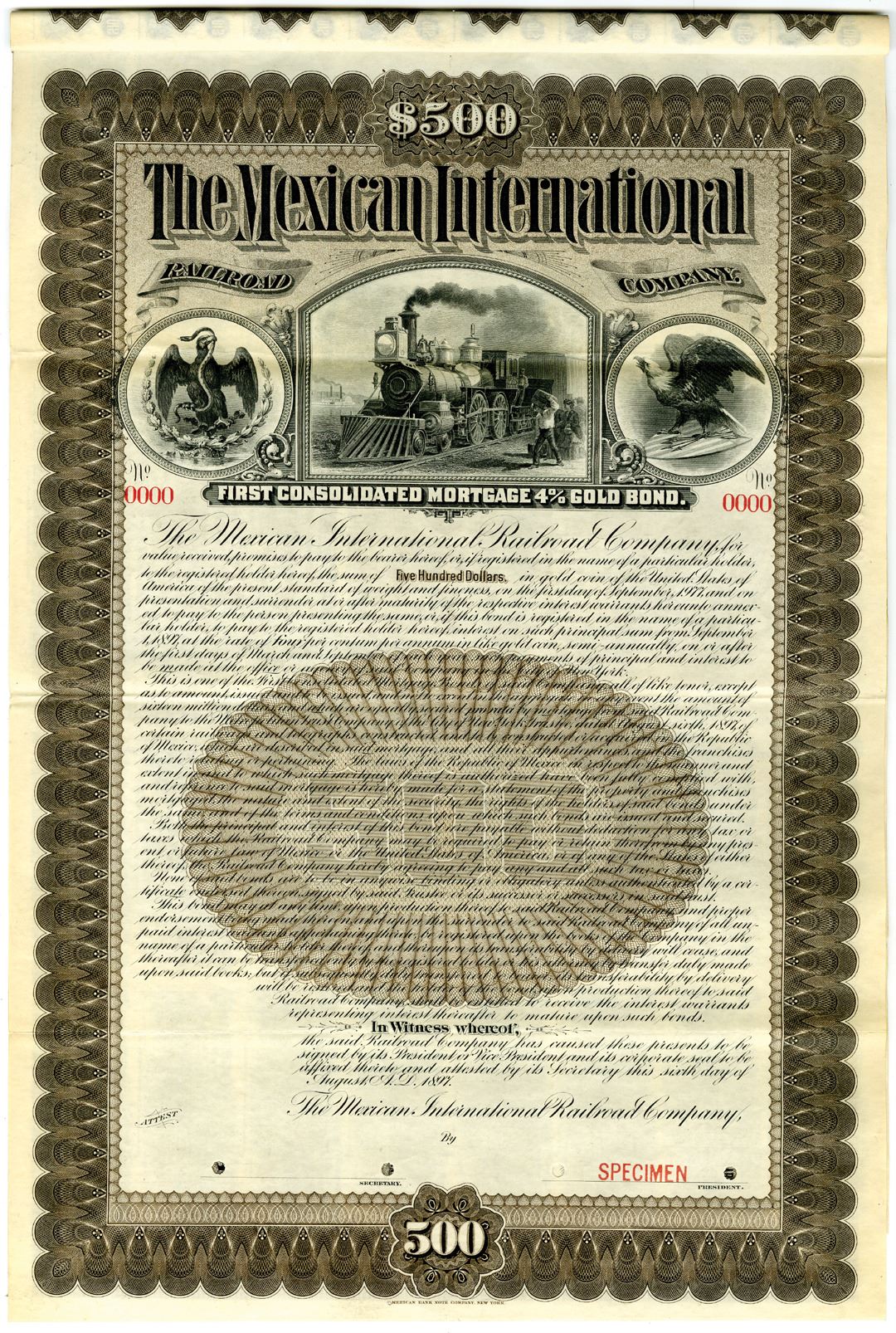 Mexico, (Incorporated in Connecticut), 1897. $500 Specimen 4% First Consolidated Mortgage Gold Coupon Bond, Black text with brown border and undertint, Men loading train flanked by Coat of Arms of Mexico and American eagle. Red specimen overprints, 0000 serial numbers, and POCs. VF condition, ABNC. Only listed as a specimen in this color and denomination, Rare in Cox.