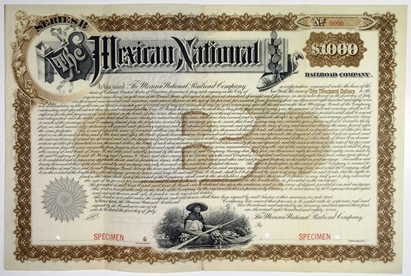 Mexico (Inc. in Colorado), 1887. $1000 Specimen Registered 6% Series B Gold Bond, Black text with brown border and undertint, Ornate title at top, native Mexican woman in canoe below. Red specimen overprints, "00000" serial numbers, POCs. VF condition, Printed by ABNC. Unlisted color and denomination in Cox. Very Rare. Only 2 examples found.