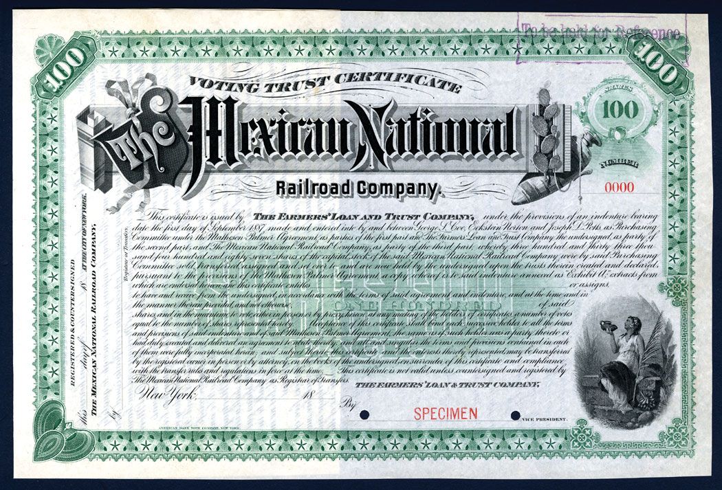 Mexico, 1887, 100 Shares, Specimen, Black with Green border and underprint, Ornate title on top with cactus and water jug on right, bottom with seated allegorical woman holding lamps, XF Condition, Specimen overprints and POC's, ABNC. Unlisted railroad in Cox, only listed as "Railway" not as "Railroad".