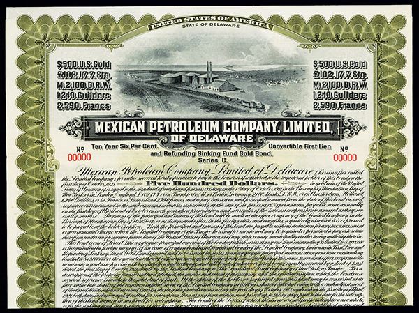 Delaware, 1911, Series C 10 Year 6% Convertible 1st Lien and Refunding Sinking Fund Gold Specimen Bond, Vertical format and coupons attached, Black on olive border and underprint, Oil storage facility with ocean in the distance, Red SPECIMEN overprints POC's and red s/n "00000", VF condition, ABNC.
