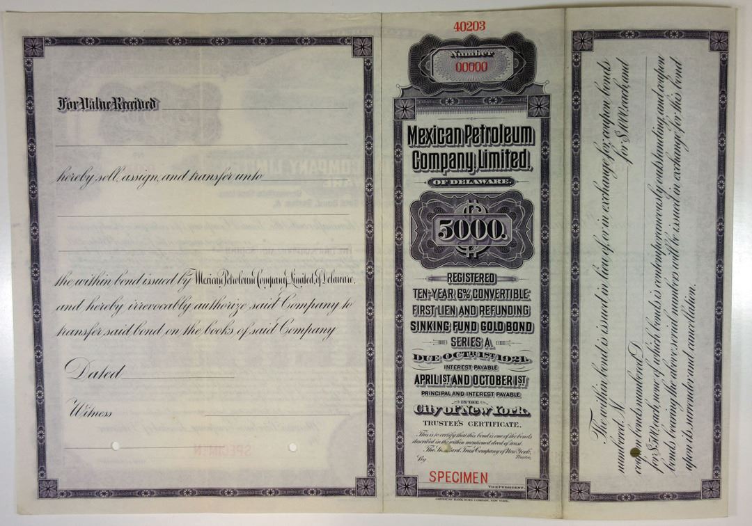 Mexico (Inc. in Delaware). $5,000 Registered 6% Series A 10 Year Convertible 1st Lien & Refunding Sinking Fund Gold Specimen Bond, Black print on purple border and under tint on horizontal format, Specimen overprints and POC's, VF-XF condition, ABNC.