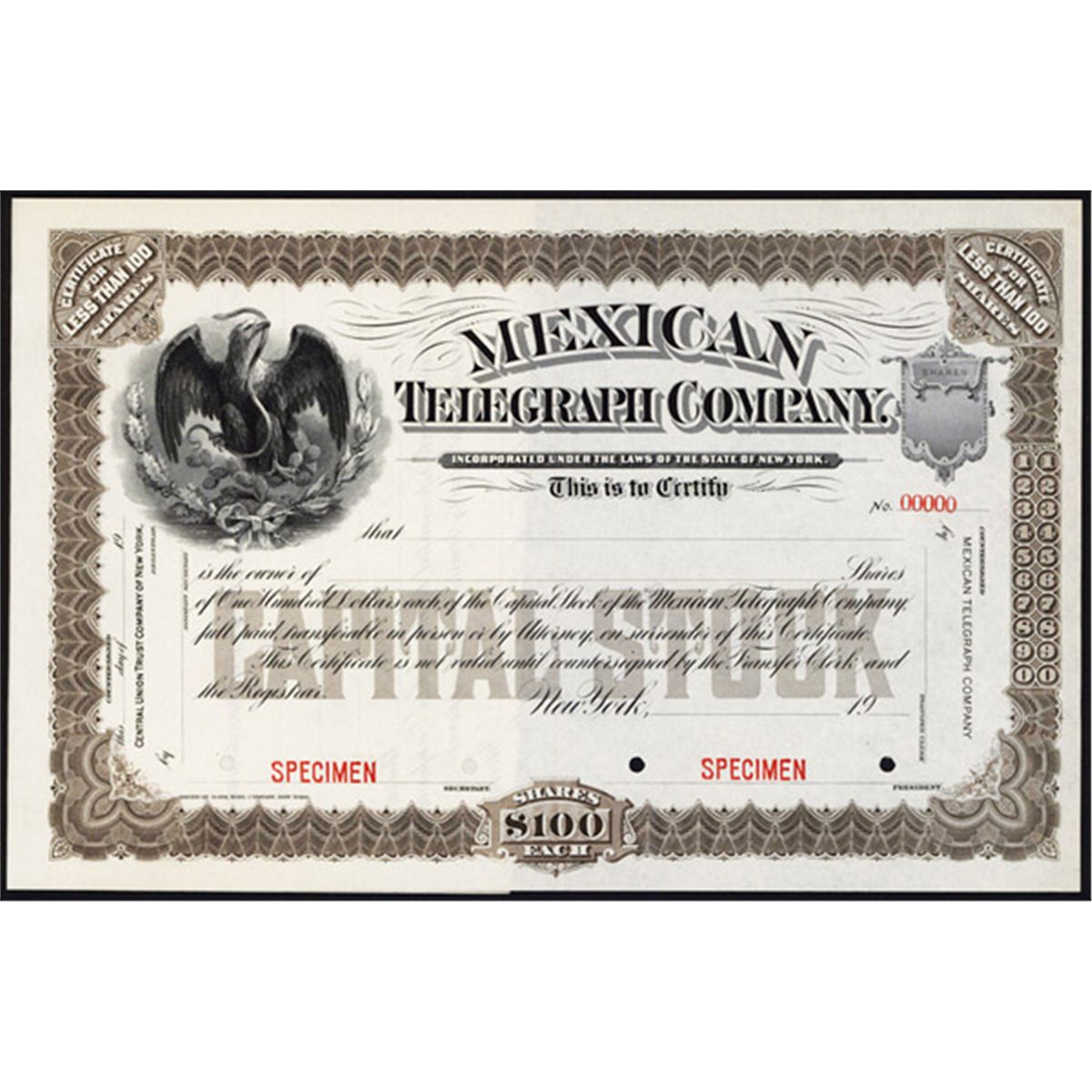 Mexico, 19xx (ca.1900), Less Than 100 Shs., Specimen, Eagle and snake, Brown, #00000, ABNC, POC's, XF. Early Mexican Telegraph Company.