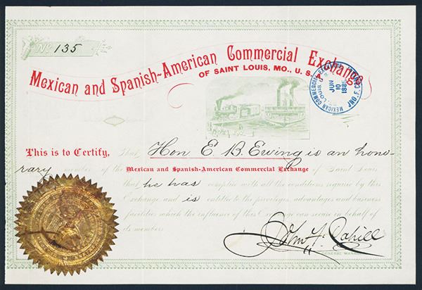 Missouri, 1885, Not an organized body but rather an exchange presided over by the Mexican consul to promote closer ties between Mexico and the U.S., Green on green border and underprint, Vignette of moving locomotive alongside steamship mid center with gold seal bottom left, VF-XF condition. Rare and early Mexican and American certificate.