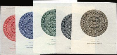 Mexico. Aztec Calendar Proof Vignettes in 5 Different Colors. 1910-60's. 5 different cut down large die proofs on india paper. Titled "Aztec Calendar" and "Banco Occidental De Mexico". This vignette is very similar or the same as the one used on the ABNC perpetual Calendar advertising card; the "Banco De Mexico" 1 Peso notes from 1936 to 1970; and the "Banco De La Republica Mexicana" banknote back vignette. Mostly choice condition. Rare group. ABNC.