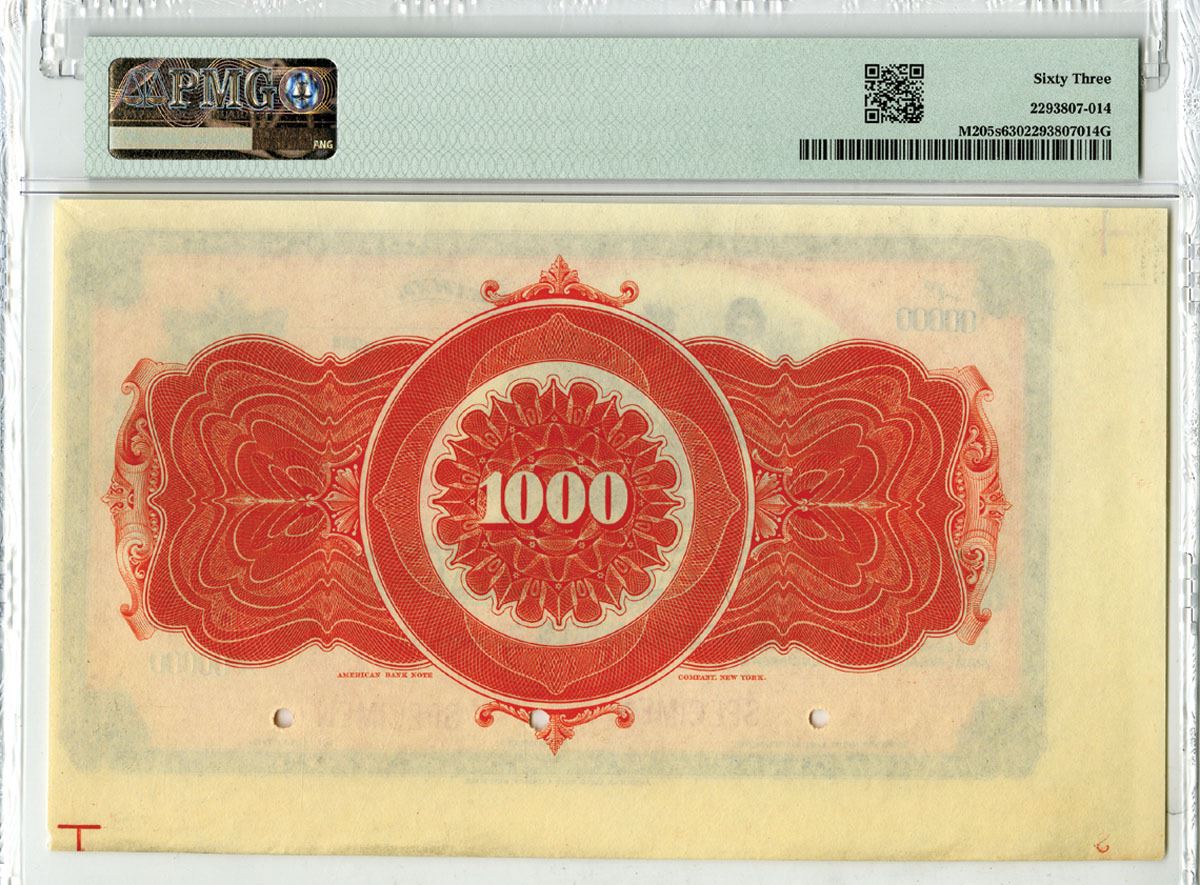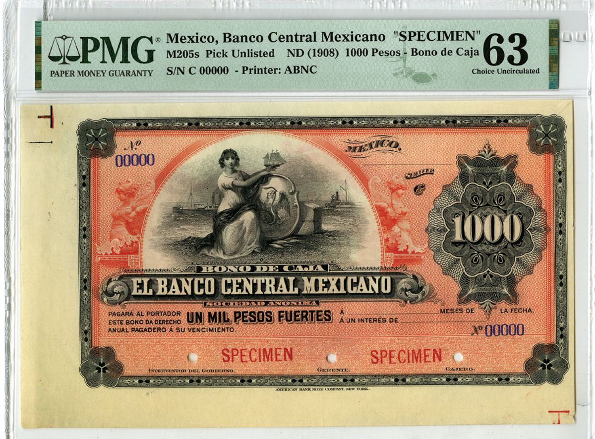 Mexico, ND (1900-1908). 1000 Pesos, Series C, P-Unlisted, M205s, Bono de Caja Specimen Banknote, black and red/orange print with seated allegorical figure beside shield at right with harbor scene in rear, back orange-red, Specimen overprints and POC's, Excess margins on left and bottom with guide lines, S/N 00000 Printer: ABNC. PMG graded Choice Uncirculated 63. Rare circulating bond.