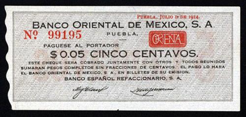 Puebla, Mexico. July 1st 1914, $0.05 CINCO CENTAVOS, (5 Centavos), P-S964, (PI-PUE-10), Issued banknote, 128 x 57mm, Black title, brown smaller text, red serial number "99195" printed on light blue paper, back with red "5 Centavos". Scalloped edges on left, Choice to Gem Uncirculated condition. Rare note in any condition and this one is superb and worthy of the most advanced collections.