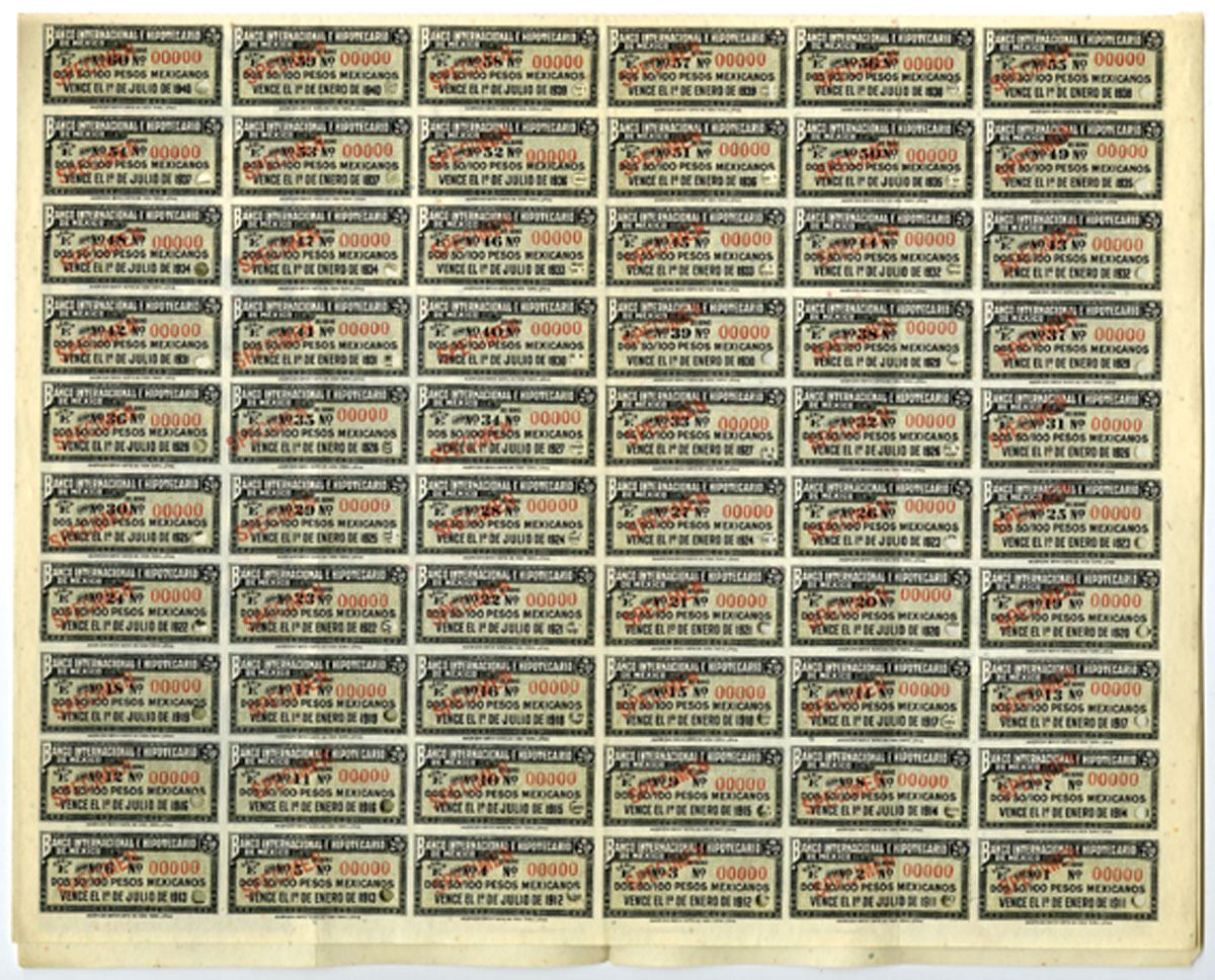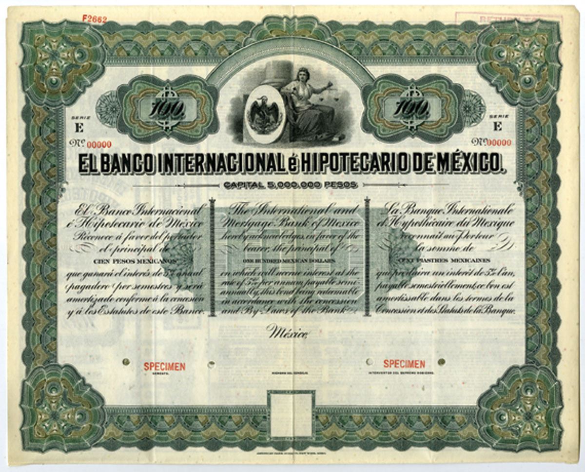 Mexico. 100 Pesos 5% Series E Specimen Bond, Ornate green and brown border with green undertint, Vignette of seated justice with arms of Mexico. Coupons attached. XF condition. ABNC. Rare bond.
