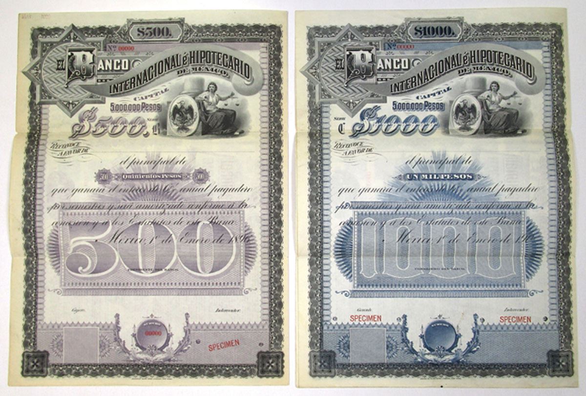 Mexico, 1896 to ND (1904). Lot of 2 Specimen Bonds, Includes: 500 Pesos, Series B, Coupon Bond, Black print with black border and purple underprint; 1000 Pesos, Series C, Coupon Bond, Black print with black border and blue underprint. Both have Allegorical woman besides arms of Mexico at lower right of title, Specimen overprints and POCs, and are in VF to XF condition. ABNC. (2). Sold "AS IS" no returns accepted.