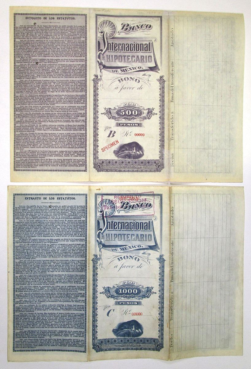 Mexico, 1896 to ND (1904). Lot of 2 Specimen Bonds, Includes: 500 Pesos, Series B, Coupon Bond, Black print with black border and purple underprint; 1000 Pesos, Series C, Coupon Bond, Black print with black border and blue underprint. Both have Allegorical woman besides arms of Mexico at lower right of title, Specimen overprints and POCs, and are in VF to XF condition. ABNC. (2). Sold "AS IS" no returns accepted.