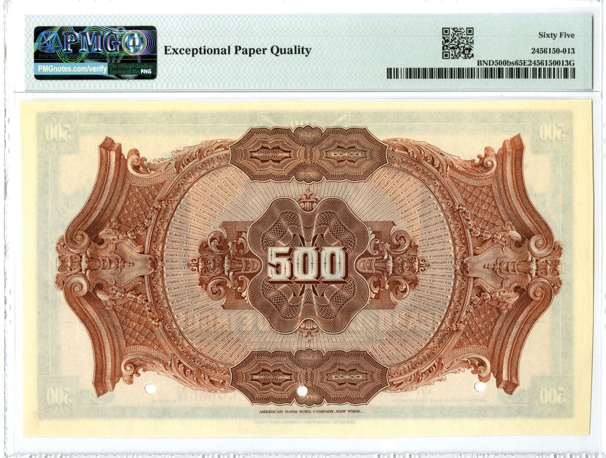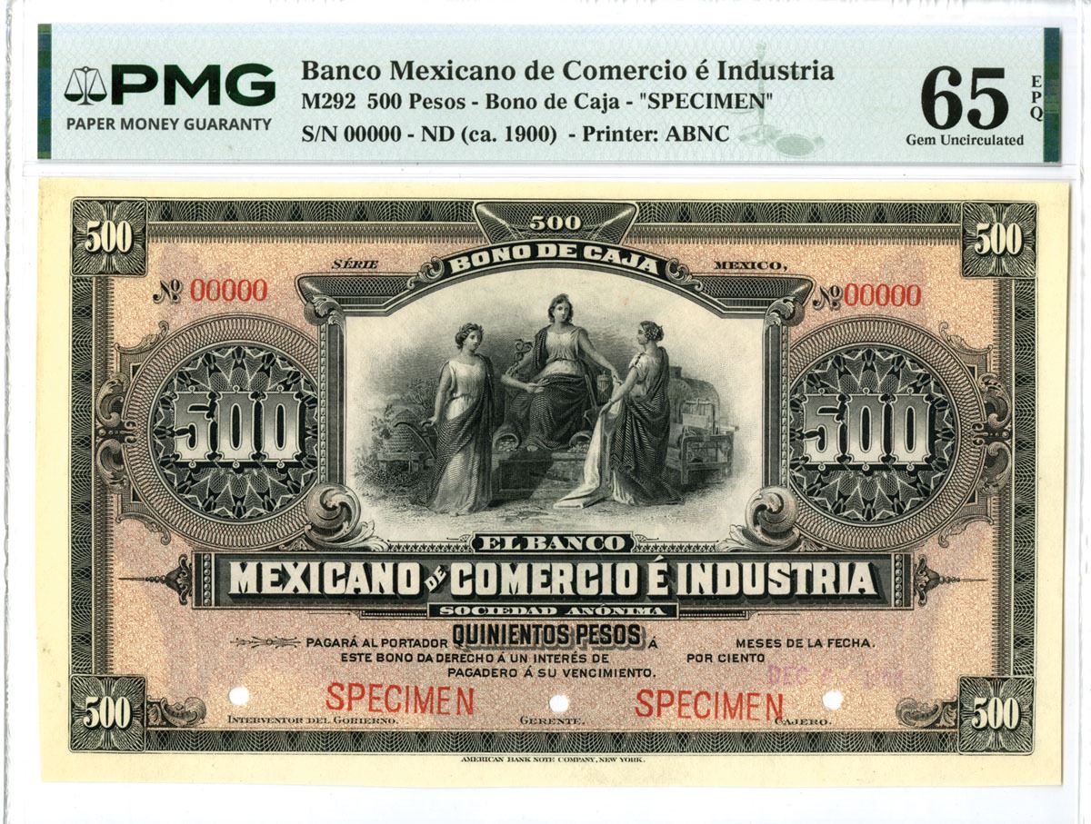 Mexico, ND (ca.1900). 500 Peso, P-Unlisted M292, Specimen Banknote, Black on brown/pink underprint, Group of three women together at center, Back is brown with denomination at center, S/N 00000, Specimen overprints and POCs, PMG graded Gem Uncirculated 65 EPQ, ABNC.