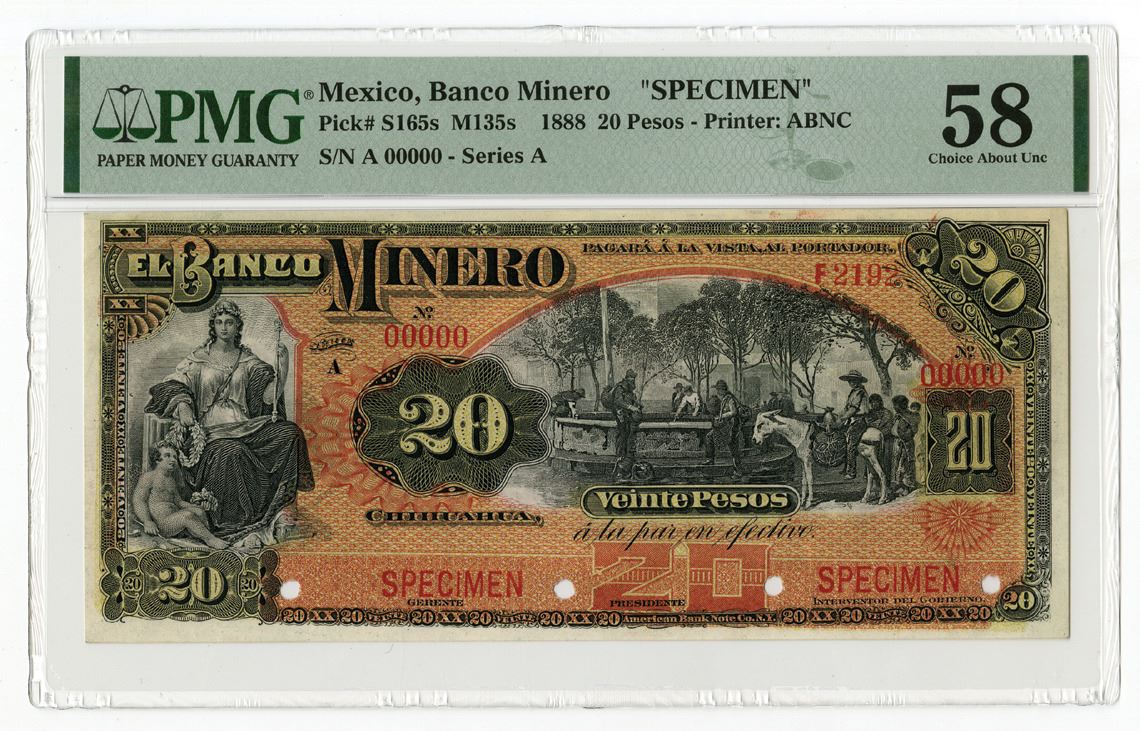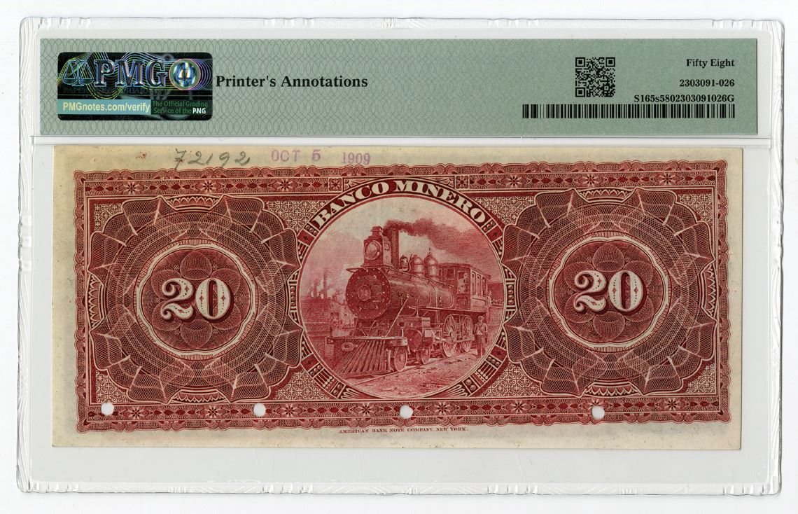 Chihuahua, Mexico, 1909. 20 Pesos, P-S165s M135s, Specimen Banknote, Black on orange and red underprint with people at fountain at center and woman and cherub at left, Back is maroon with train at center, Specimen overprint and POCs, S/N A 00000 - F2192, PMG graded Choice About Uncirculated 58 with comment "Printer's Annotation," ABNC.