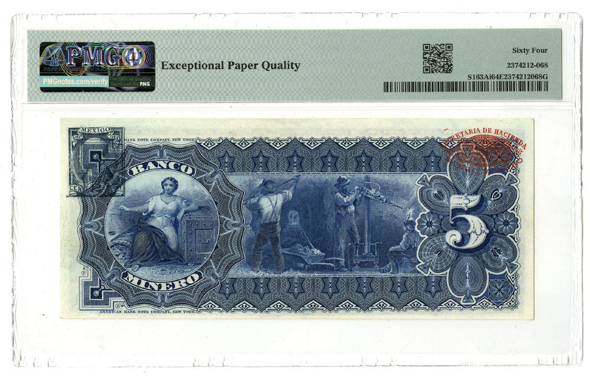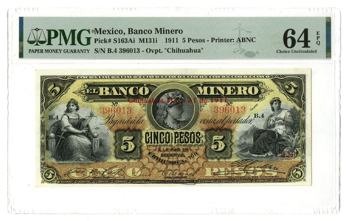 Chihuahua, Mexico, 1911. 5 Pesos, Series B.4, P-S163Ai, M131i, Issued Banknote, Black on orange and yellow underprint, Seated woman (Justice) at left and seated woman (Tropics NO. 3) at right, Back is blue with allegorical woman with safe and coins at left and miners at center, S/N B.4 396013, PMG graded Choice Uncirculated 64 EPQ. Only 1 notes grades higher out of 8 notes graded in the PMG census.