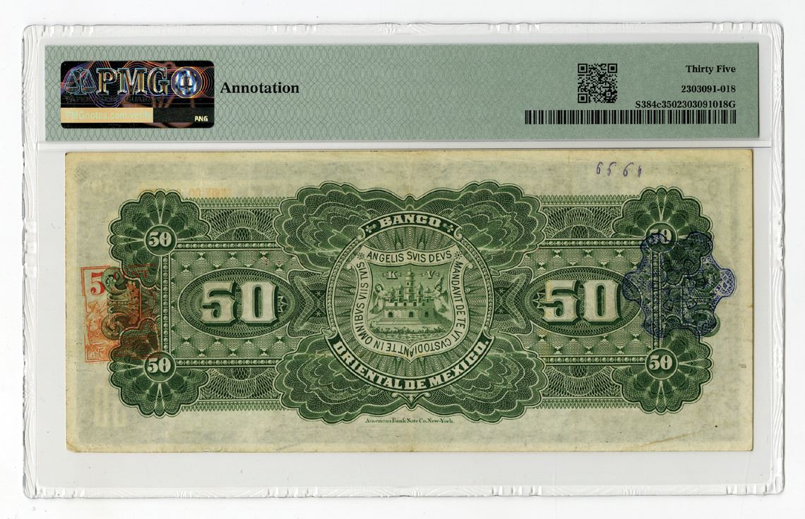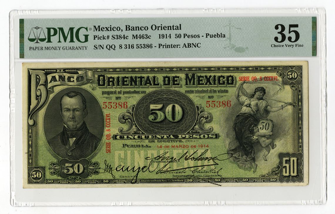 Puebla, Mexico, March 14, 1914. 50 Pesos, Series QQ, P-S384c M463c BK-PUE-44, Issued Banknote, Black on green underprint with portrait of Esteban de Antunano at left and standing female with horn & cherub at right, S/N QQ 8 316 55386, Back is green with state arms at center and orange stamp at left, PMG graded Choice Very Fine 35 with comment "Annotation," ABNC.