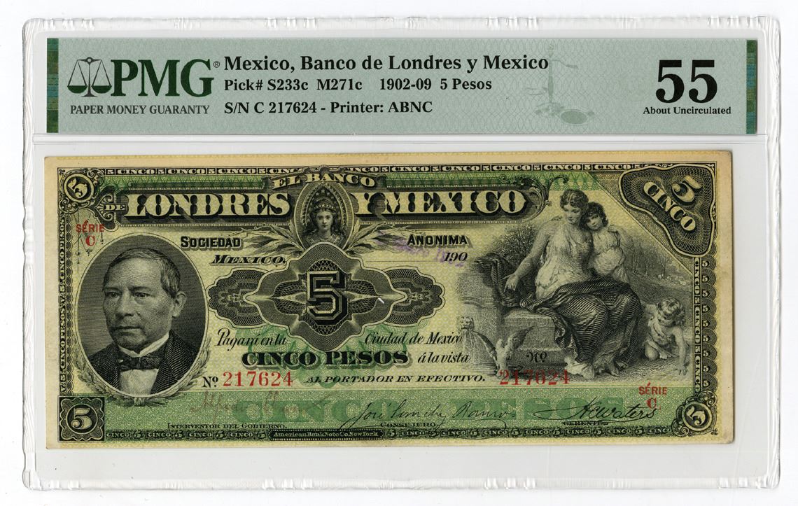 Mexico, 1902 (purple hand-stamped date). 5 Pesos, Series C, P-S233c M271c BK-DF-27, Issued Banknote, Black on green and yellow underprint, Portrait of Pablo Benito Juarez at left and seated woman with children at left, Back is green with National Arms of Mexico at center, Large even borders and bright colors enhance this lovely note. S/N C 217624, PMG graded About Uncirculated 55, ABNC. Second Highest Graded Issued Note out of 4 Notes Graded in the PMG Census as well as the Earliest Date graded. The next earliest date is 1906.