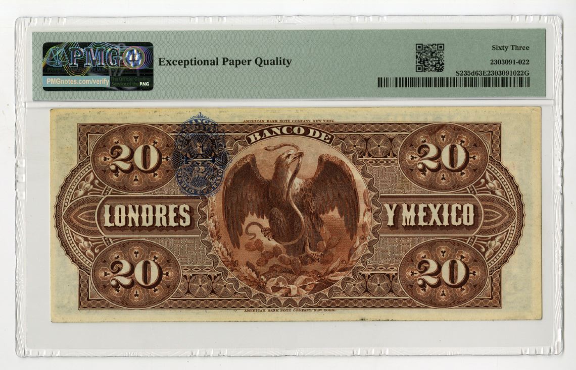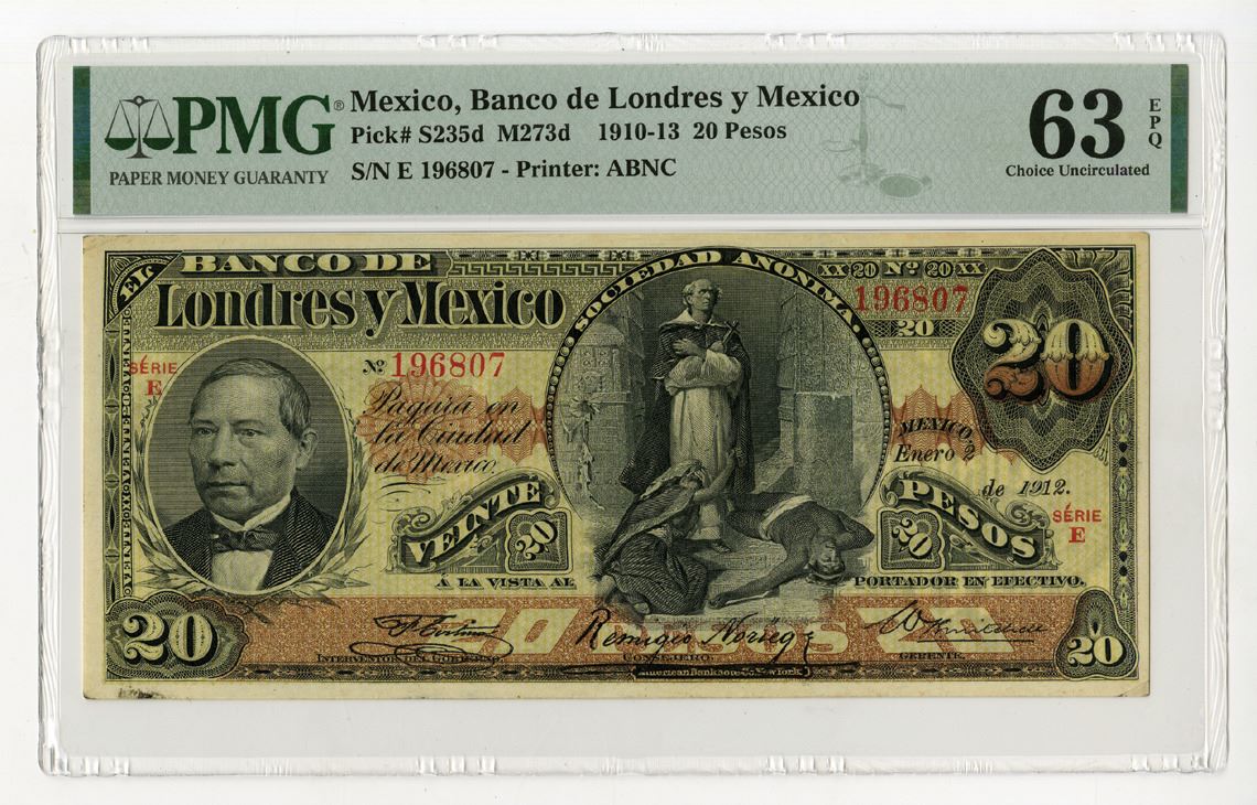 Mexico, January 2, 1912. 20 Pesos, Series E. P-S235d M273d BK-DF-71, Issued Banknote, Black on orange-brown and yellow underprint, Portrait of Pablo Benito Juarez at left and Friar Bartolome de las Casas at center, Back is brown with National Arms of Mexico at center and blue stamp at left, Extremely attractive note with bright colors, sharp corners and large even margins. S/N E 196807, PMG graded Choice Uncirculated 63 EPQ, ABNC. Top Pop and highest graded out of 20 graded in the PMG census.