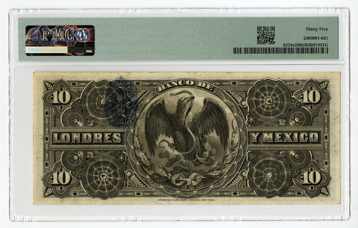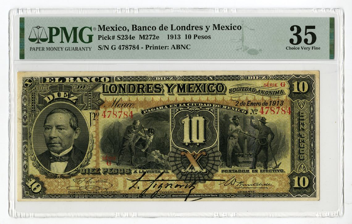 Mexico, January 2, 1913. 5 Pesos, P-S234e M272e BK-DF-50, Issued Banknote, Black on brown and yellow underprint, Portrait of Pablo Benito Juarez at left and miners at right, Back is brown with National Arms of Mexico at center, S/N G 478784, PMG graded Choice Very Fine 35, ABNC.