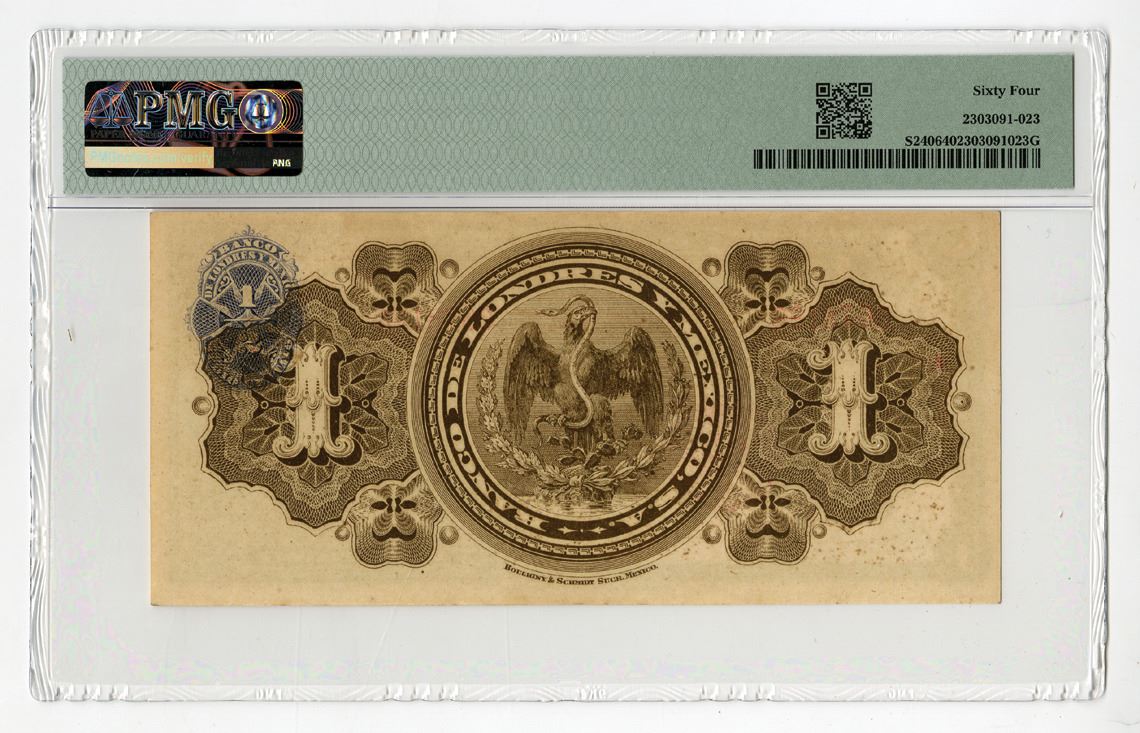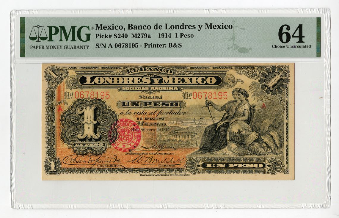 Mexico, 1914. 1 Peso, P-S240 M279a BK-DF-20, Issued Banknote, Black on orange underprint, Seated Justice and Peace at right, Back is brown with National Arms of Mexico at center, S/N A 0678195, PMG graded Choice Uncirculated 64 EPQ, B&S. Only 1 note grades higher out of 20 graded in the PMG census.