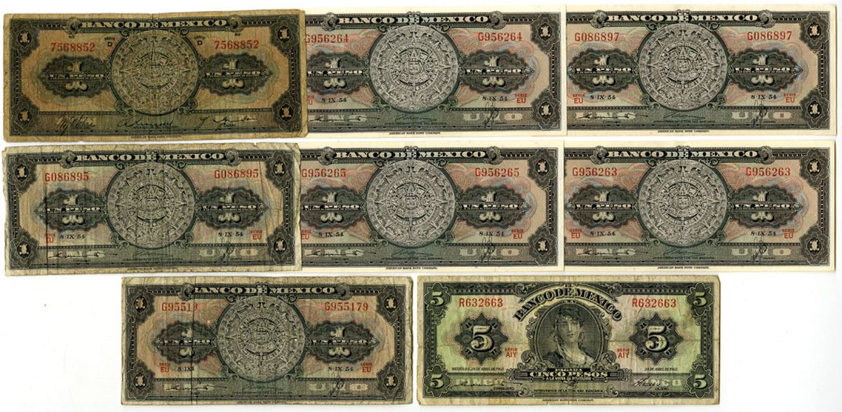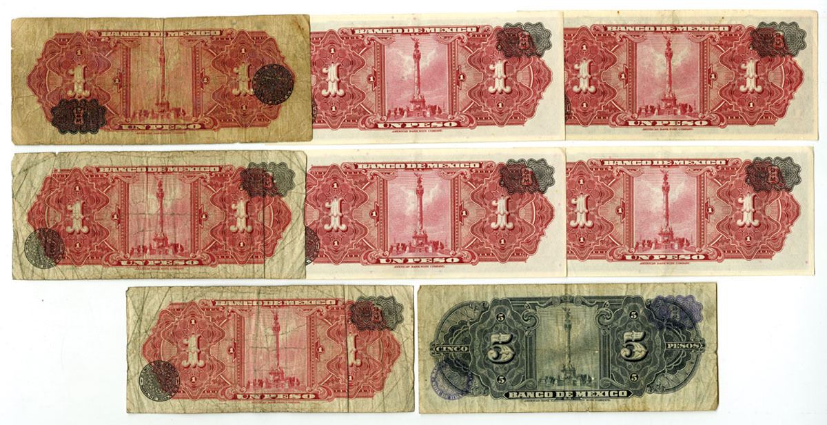 Mexico, ND (1936)-1963. Lot of 8 Issued Banknotes, Includes: ND (1936), 1 Peso, P-28d; 1954, 1 Peso, P-56b (6); 1963, 5 Pesos, P-60h. Notes range from Good to AU condition and printed by ABNC. (8). Sold "AS IS" no returns accepted.