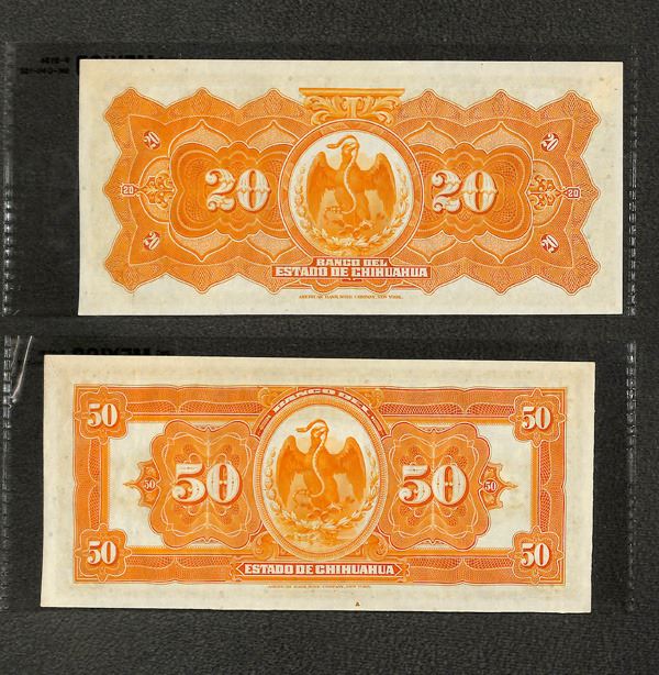 Chihuahua, Mexico. 11 issued banknotes: 5 Pesos, Ser.A, Pick #S132a (4; BK-CHI-148); 10 Pesos, Ser.A, #S133a (2; BK-CHI-149); 20 Pesos, Ser.A, #S134a (2; BK-CHI-150); 50 Pesos, Ser.A, #S135a (BK-CHI-151); 100 Pesos, Ser.A, #S136 (BK-CHI-153); and 500 Pesos, Ser.A, #S137a (BK-CHI-154). All in VF to Uncirculated condition. American Bank Note Company (11). Shipping charges apply - weight 1 lbs.